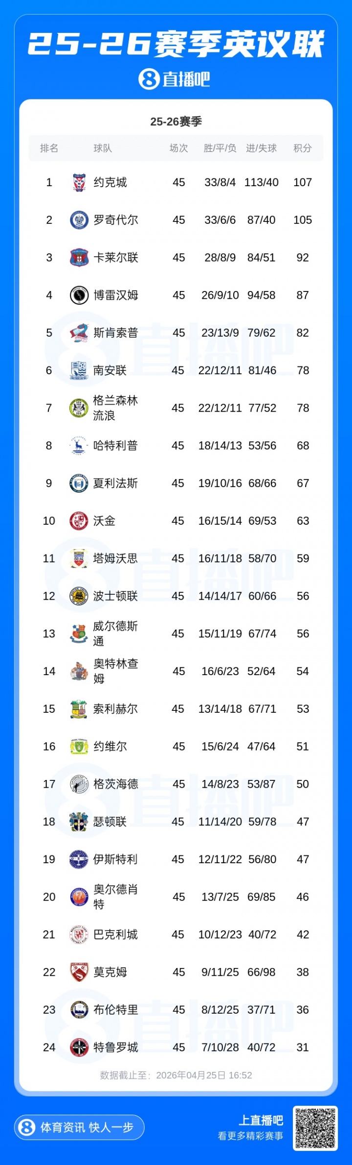 04月25日讯 北京时间今晚19点30分,英格兰全国联赛(第5级别)末轮同时开赛,前二球队约克城(107分)和罗奇代尔(105分)将直接交锋,只有一支球队能直通下赛季英乙,另一支球队将参加附加赛。赛前约克城和罗奇代尔发表联合声明,抗议这种不公。